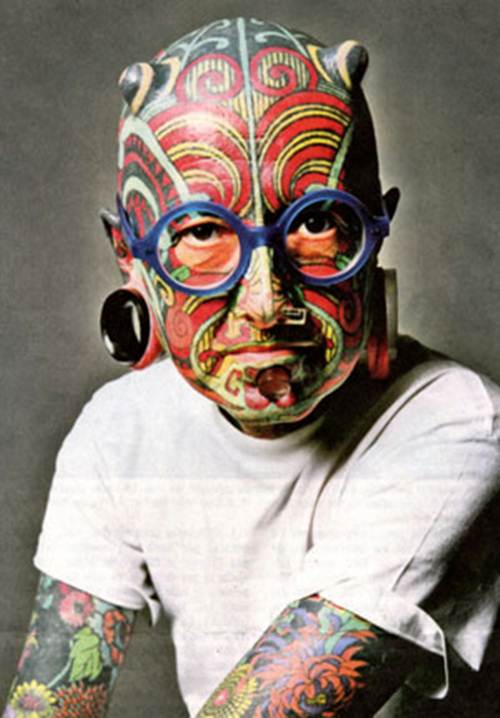 Etienne did his first tattoo back in 1974 and his bodywork has been in progress ever since. Along with the full bodysuit, he’s got plexiglass plugs on his chin, nostrils, 70mm plugs in his earlobes, a titanium ring on his left hand and two horns in his head, which he plans to get bigger silicon implants for!