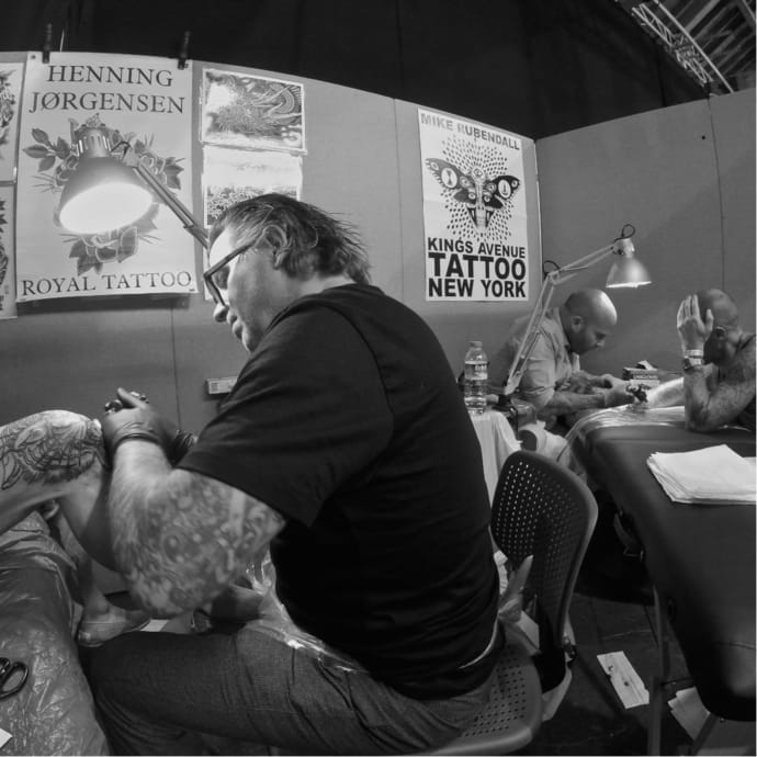 Master tattooers Henning Jorgensen (Royal Tattoo) and Mike Rubendall (Kings Avenue) work side by side at the 2015 London Tattoo Convention. Photo by Jessica Paige.
